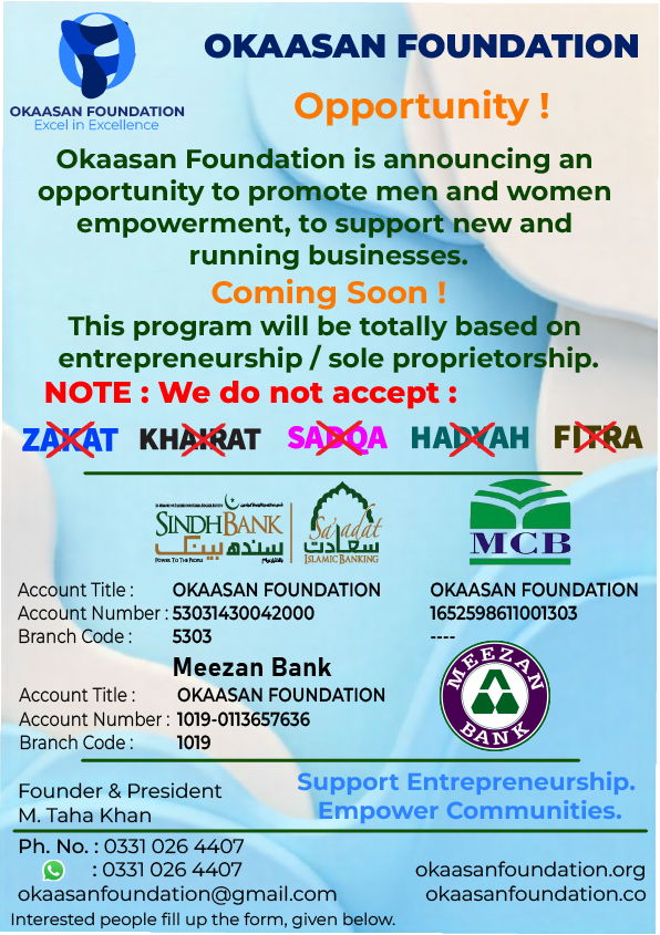 Okaasan Foundation is a Non-Profit Organization and was registered in 2024 / 2025 in Pakistan having registration number KAR NO. 058 2024-25.
